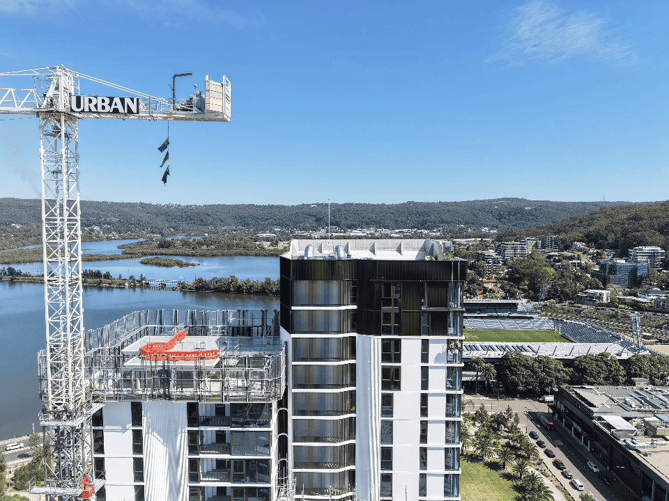 Following the removal of scaffolding on a newly constructed 25-storey residential building in Gosford, a range of finishing items became visible across the façade.